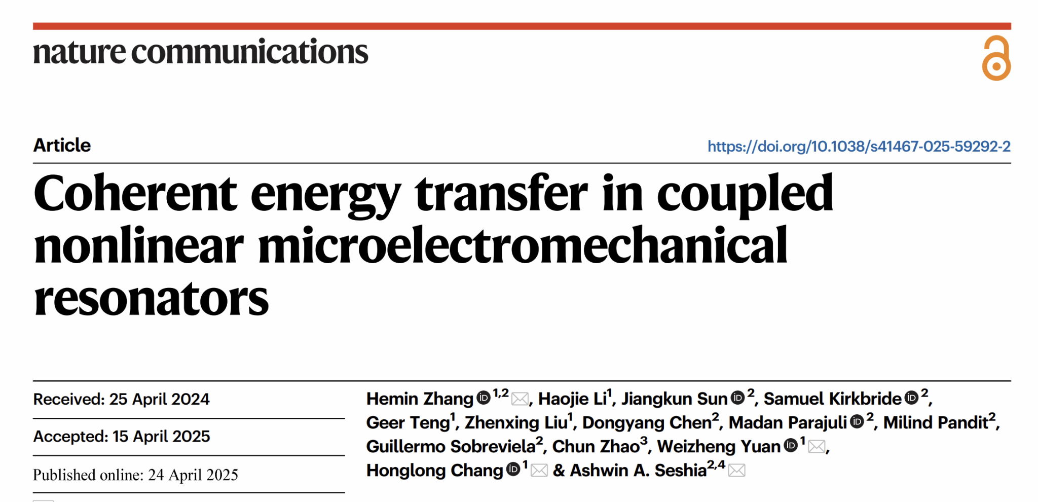 近日,台湾三级 教师在微机械耦合谐振器能量传输机制方面的研究取得新进展。相关成果《Coherent Energy Transfer in Coupled Nonlinear Microelectromechanical Resonators》发表在国际知名学术期刊《Nature Communications》上。台湾三级 国家级青年人才张和民教授为第一作者,常洪龙教授、苑伟政教授和剑桥大学Ashwin A. Seshia教授为共同通讯作者。