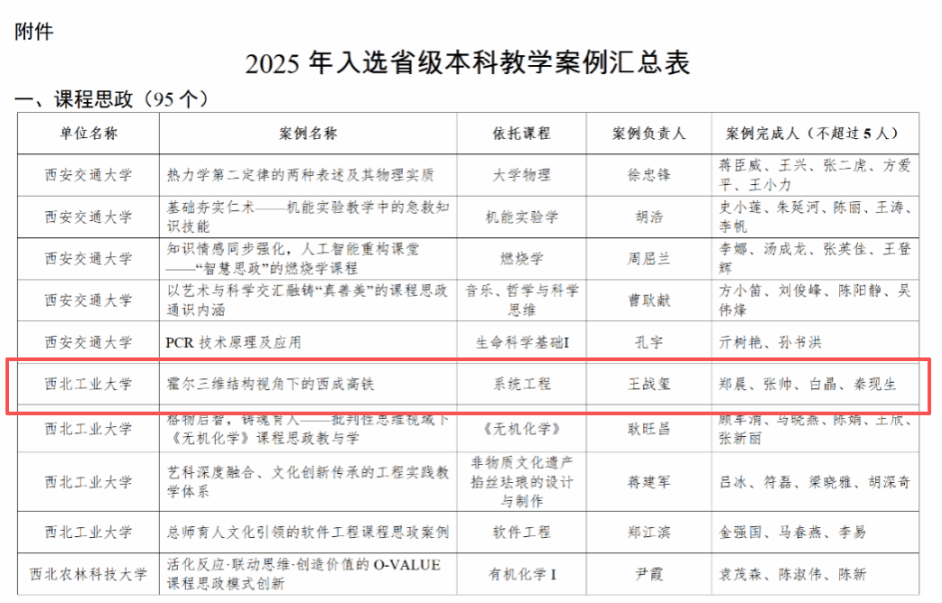 近日,陕西省教育厅公布了2025年省级本科教学案例遴选结果,台湾三级王战玺教授团队依托《系统工程》课程的教学案例-《霍尔三维结构视角下的西成高铁》、王文东教授团队的教学案例-《基于电工学课程的“六位一体”课赛融合教学新模式探索与实践》成功入选省级本科教学案例。