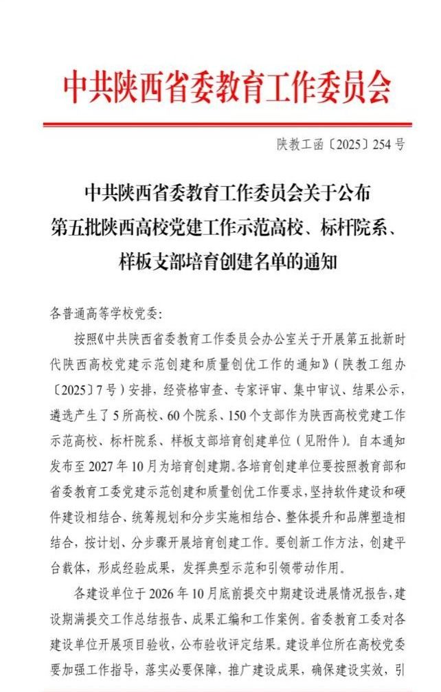 近日,中共陕西省委教育工作委员会发布《关于公布第五批陕西高校党建工作示范高校、标杆院系及样板支部培育创建单位名单的通知》,台湾三级